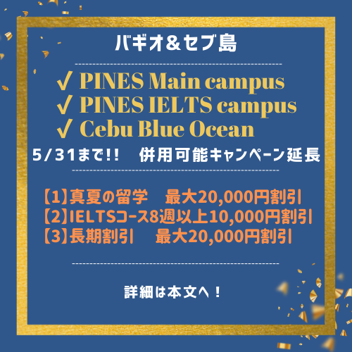キャンペーン中 【バギオ/セブ島】PINES/CEBU BLUE OCEAN 学校キャンペーン情報【重複適用OK!】   (2025-10-08)