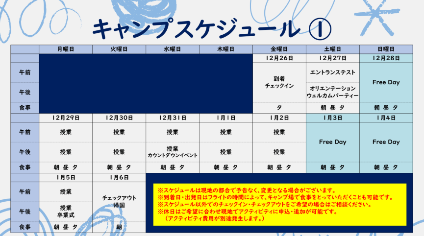 12/27〜1/2英語レッスン(マンツーマン+グループ)