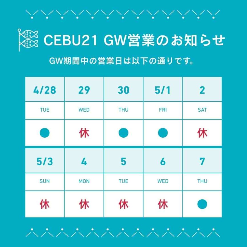 【CEBU21】2026年 GW営業のお知らせ:ページトップに戻る