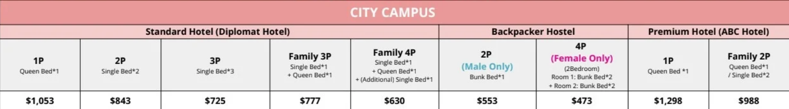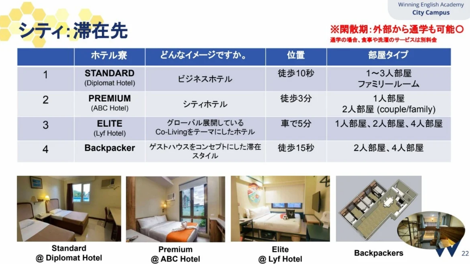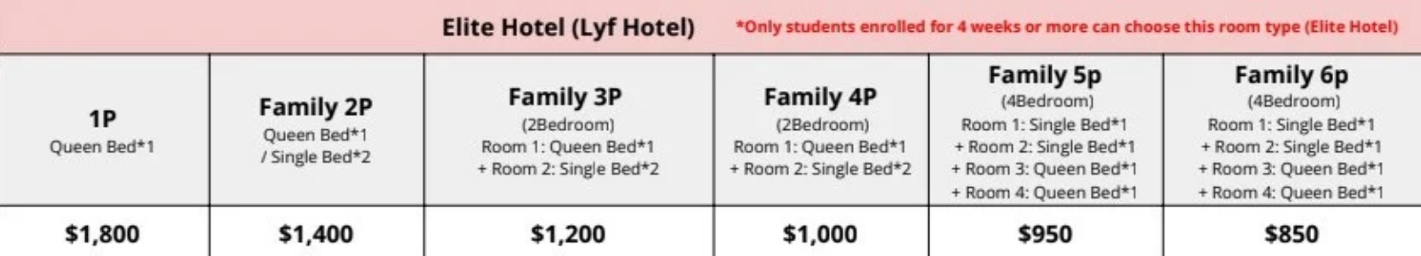 宿泊施設としてもう1か所、Lyf Hotel(車で約5分)もご案内可能ですが、徒歩でで通学ですと少し距離があること、費用も上記3か所よりグッと上がってしまうので個人でお申し込みされる方は少ないのが特徴です。
