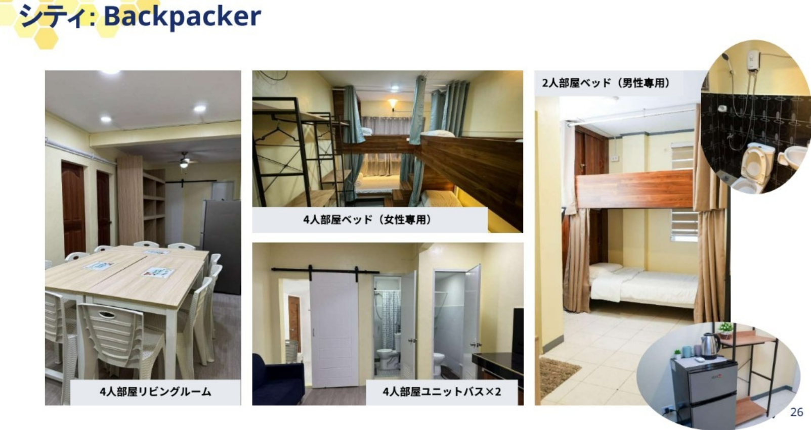 男性の場合はバックパッカー4人部屋の提供はなく、2人部屋のご案内となります。