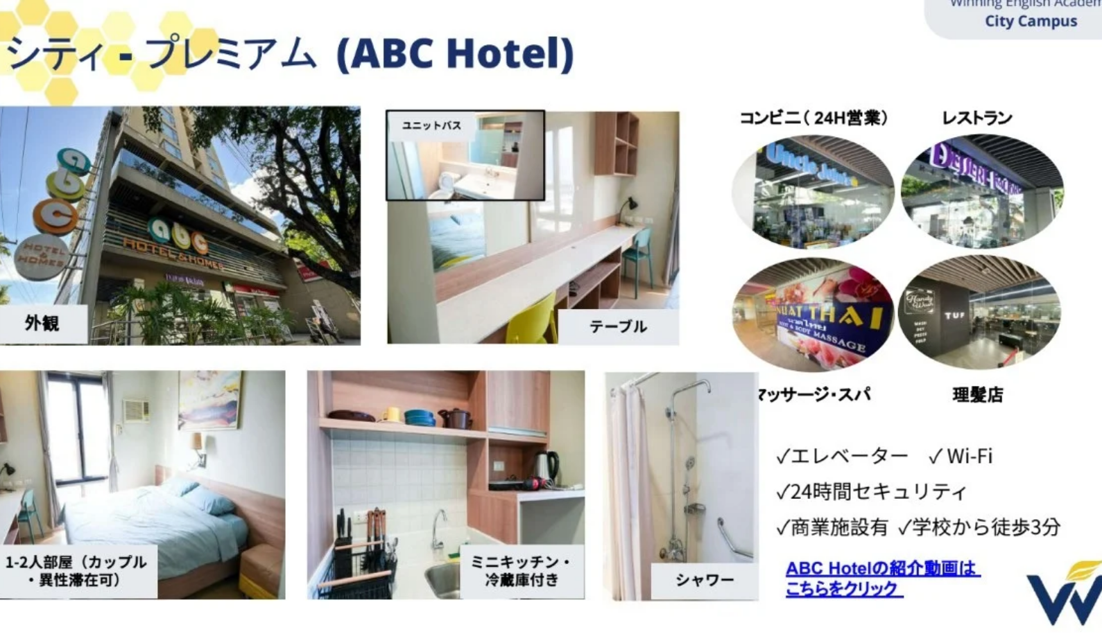 ABC Hotelは学校から徒歩3分程のところにあります。