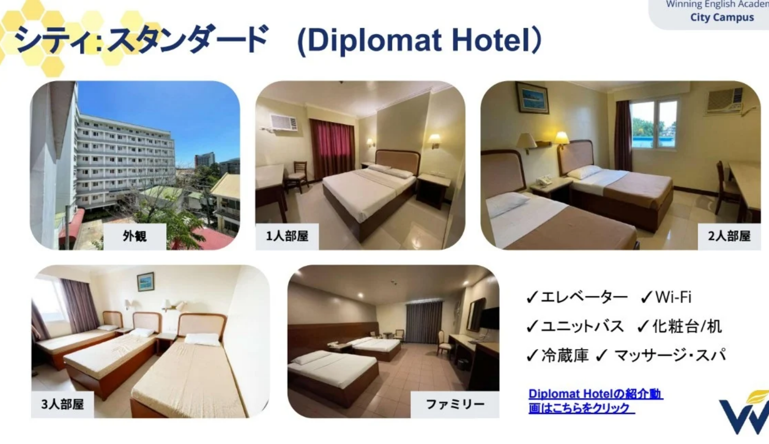 正直ホテルのクオリティーもディプロマと比べて大きく変わるわけではないので、学校からより近くて安いディプロマの方がおすすめです。