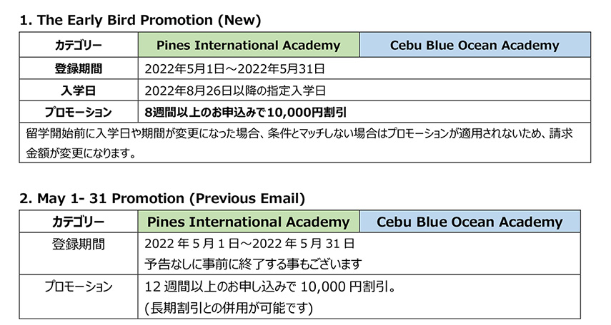 キャンペーン終了 【PINES2校/Cebu Blue Ocean Academy共通】割引プロモーション   (2022-09-27)